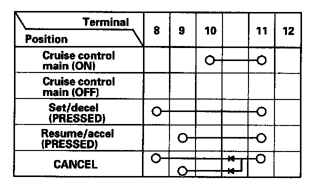 - If there is continuity, and it matches the table, but switch failure occurred on the cruise control input test, check and repair the wire harness on the switch circuit.