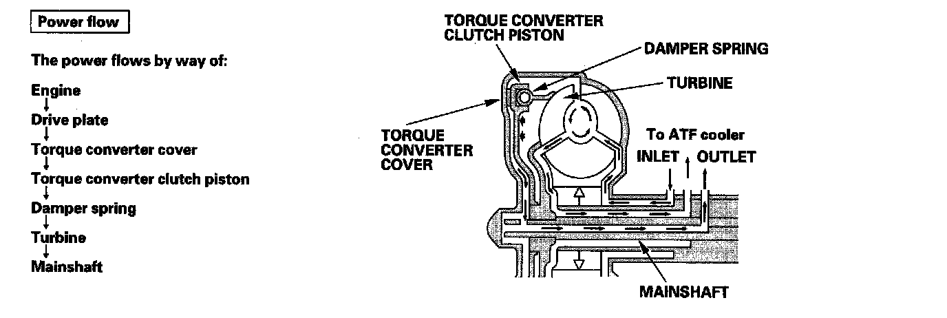 Fluid enters into the chamber between the torque converter cover and the torque converter clutch piston and passes through the torque converter and goes out through the chambers between the turbine and the stator, and between the pump and the stator. As a result, the torque converter clutch piston moves away from the torque converter cover, and the torque converter lock-up clutch is released; the torque converter clutch lock-up is OFF.