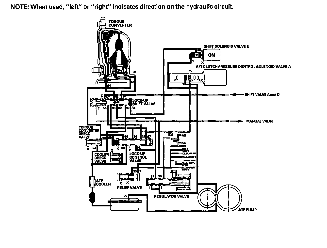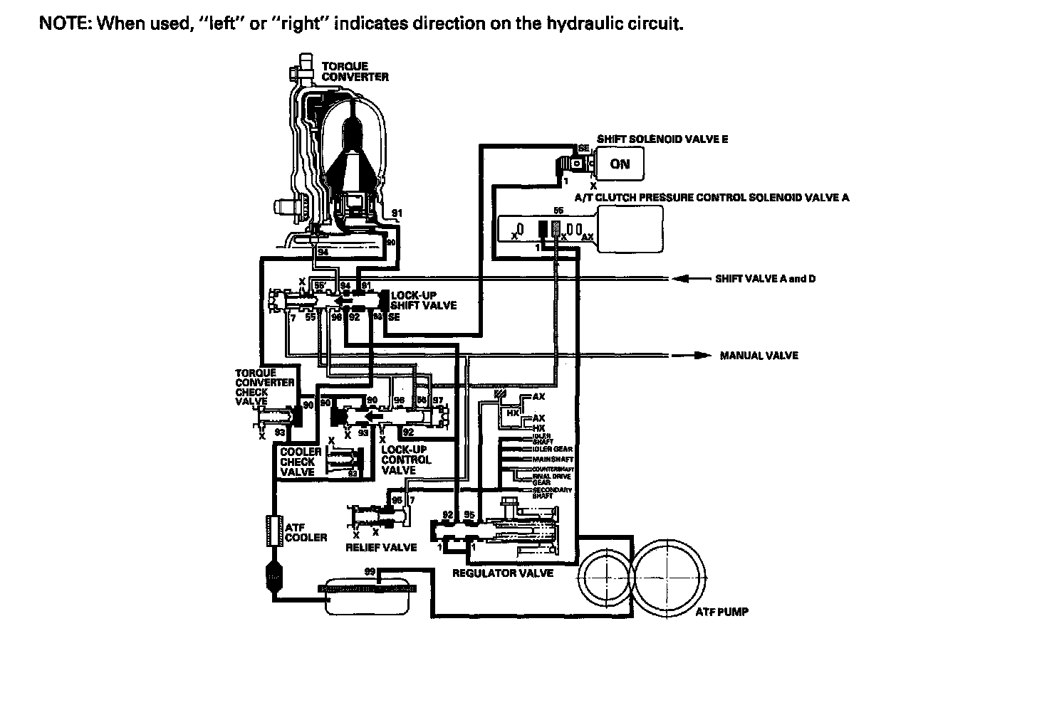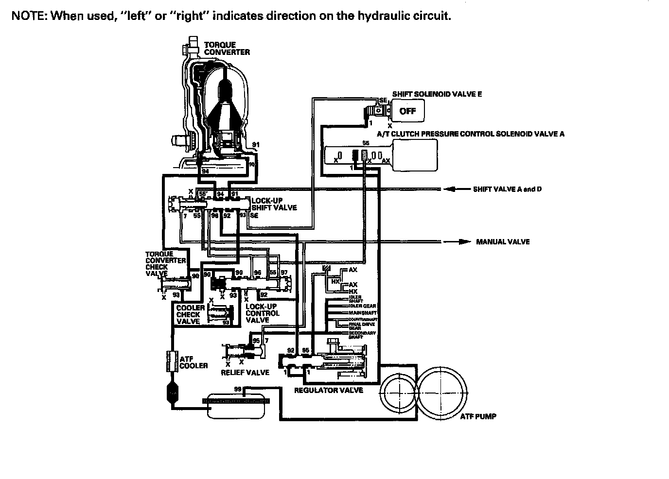 The PCM turns shift solenoid valve E OFF, and shift solenoid valve E pressure (SE) is not applied to the lock-up shift valve. The lockup shift valve remains to the right uncovering the torque converter pressure ports leading to the left side of the torque converter, and releasing pressure from the right side of the torque converter. Torque converter pressure (92) changes to 94) at the, lock-up shift valve, and enters into the left side of the torque converter to disengage the torque converter clutch. This keeps the torque converter clutch piston keeps away from the torque converter cover and the torque convener clutch lock-up is OFF.