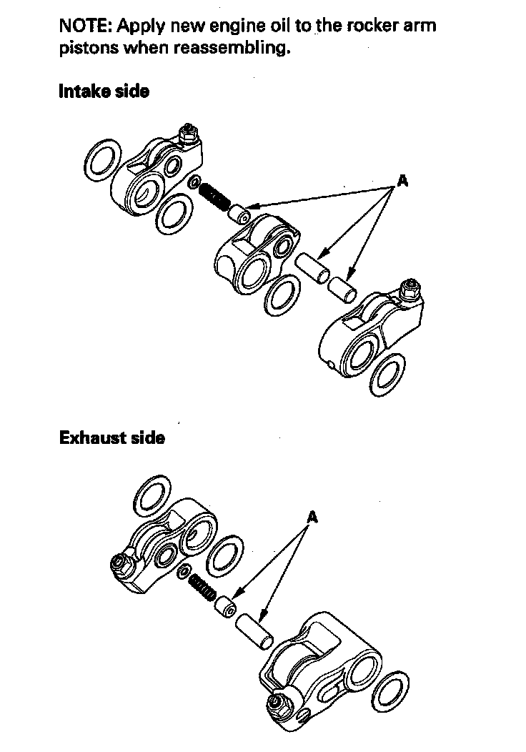8. Inspect the rocker arm pistons (A). Push on each piston manually. If it does not move smoothly, replace the rocker arm set.