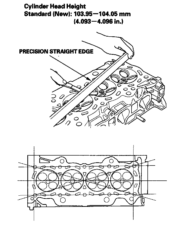 3. Check the cylinder head for warpage. Measure along the edges, and three ways across the center.