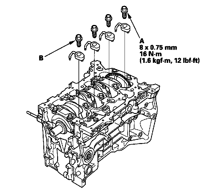 3. Remove the oil jet bolts (A), then remove the oil jets (B).