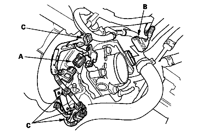 9. Disconnect the manifold absolute pressure (MAP) sensor connector (A) and throttle actuator connector (B), then remove the wire harness clamps (C).
