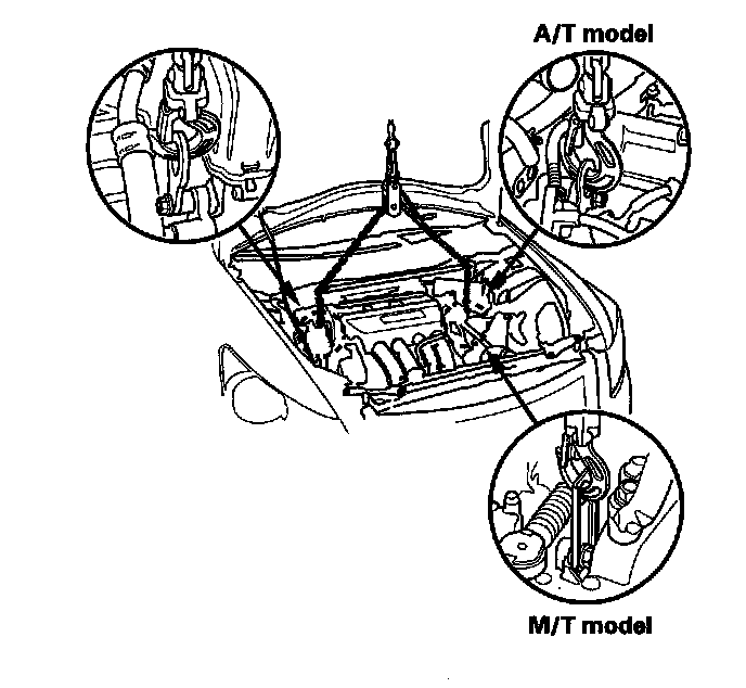 2. Raise the vehicle on the lift, and position the engine/transmission under the vehicle. Lower the vehicle, and attach the universal eyelet (07AAK-SNAA120) and chain hoist to the engine, then lift the engine into position in the vehicle.