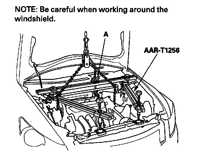 4. Install the engine support hanger (AAR-T1256), then attach the hook to the slotted hole in the engine hanger adapter. Tighten the wing nut (A) by hand to lift and support the engine/transmission.