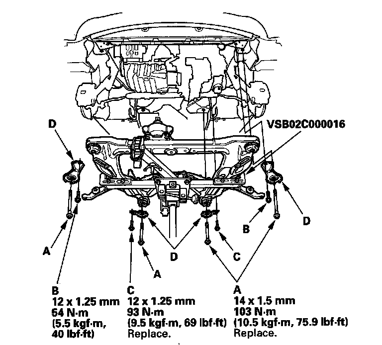 14. Loosely install the new front subframe mounting bolts (four) (A), the stiffener mounting bolts (four) (B) (C), and the stiffeners (four) (D).