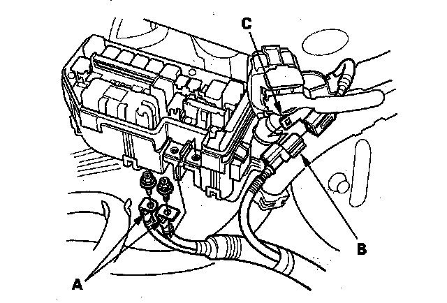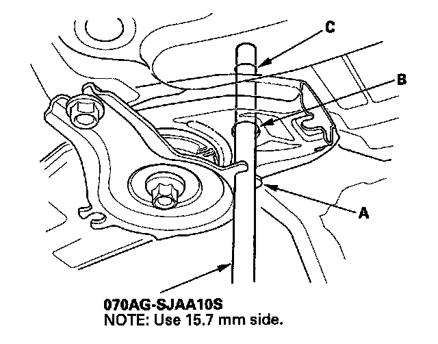 28. Tighten the front engine mount bolt (A), then install the front engine mount stop (B) and the vacuum hose (C).