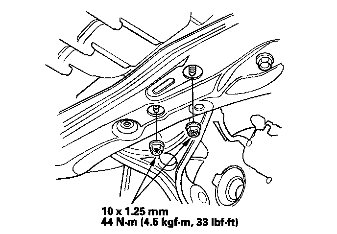 19. With the frame positioning guide pin in place, tighten the subframe right rear mounting bolt.