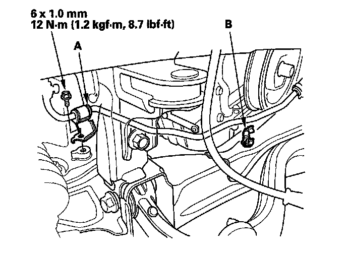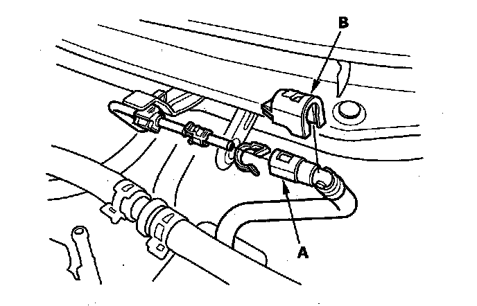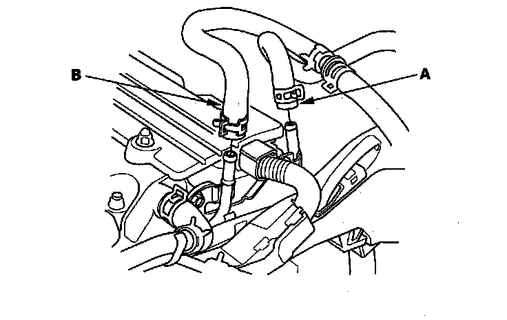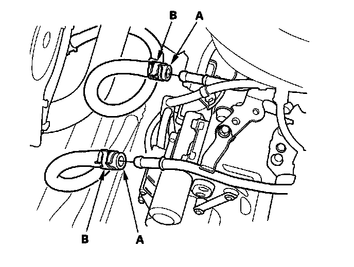 57. Install the evaporative emission (EVAP) canister hose (A) and the brake booster vacuum hose (B).