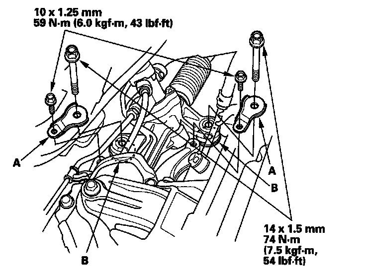 40. Install the bolts securing the steering gearbox mounting bracket (A) and the heat shield (B). (right side)