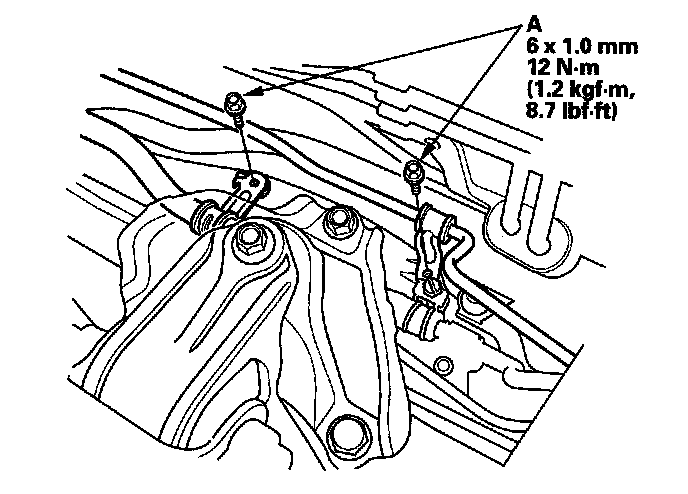 38. Install the two bolts (A) securing the power steering (P/S) fluid line brackets.