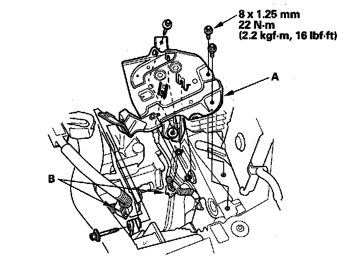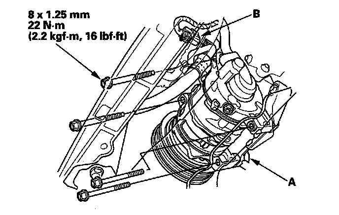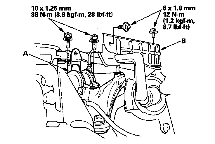 31. A/T model: Install the rear engine mount upper bracket (A), then install the rear engine mount (B).