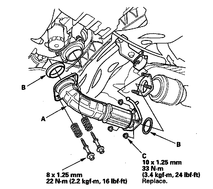 47. Install exhaust pipe A using new gaskets (B) and self-locking nuts (C).