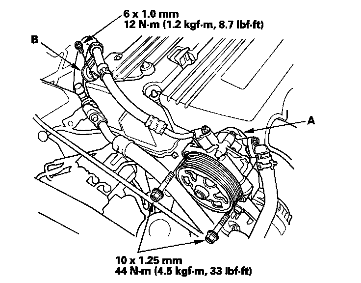 54. Install the P/S pump (A), then install the P/S hose bracket (B).
