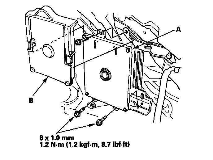60. Install the ECM/PCM (A), then install the ECM/PCM cover (B).