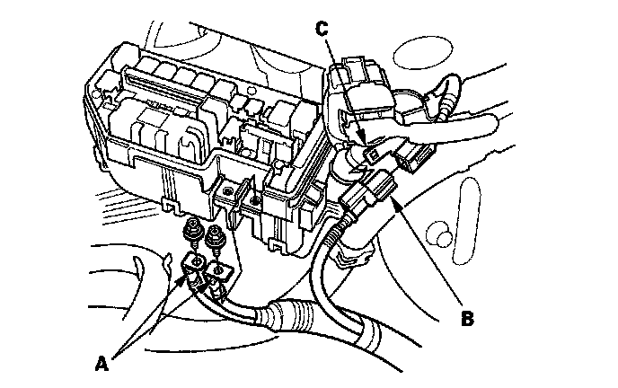 10. Disconnect the harness connector (B), and remove the harness connector from the bracket (C).