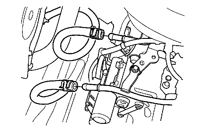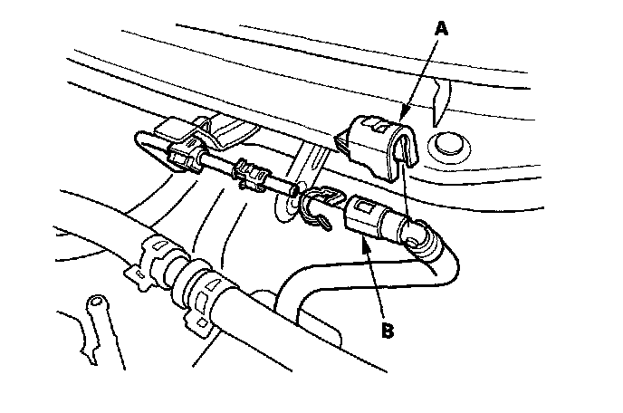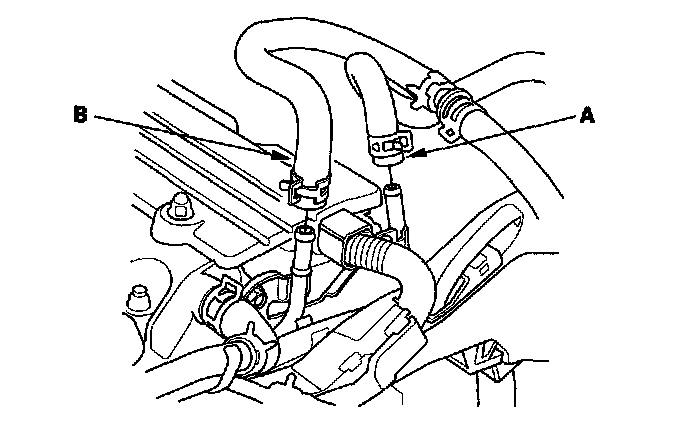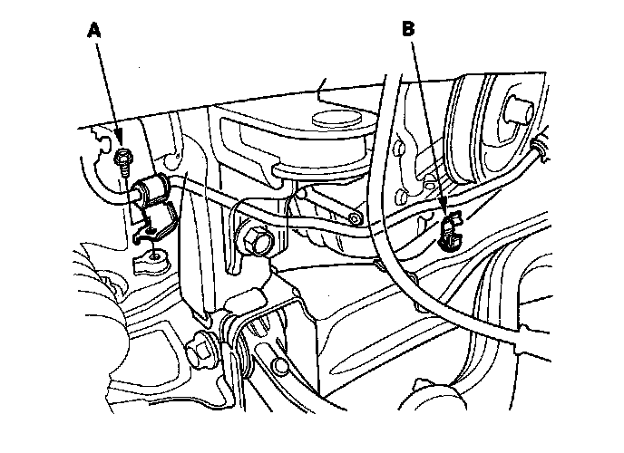 14. Remove the evaporative emission (EVAP) canister hose (A) and the brake booster vacuum hose (B).