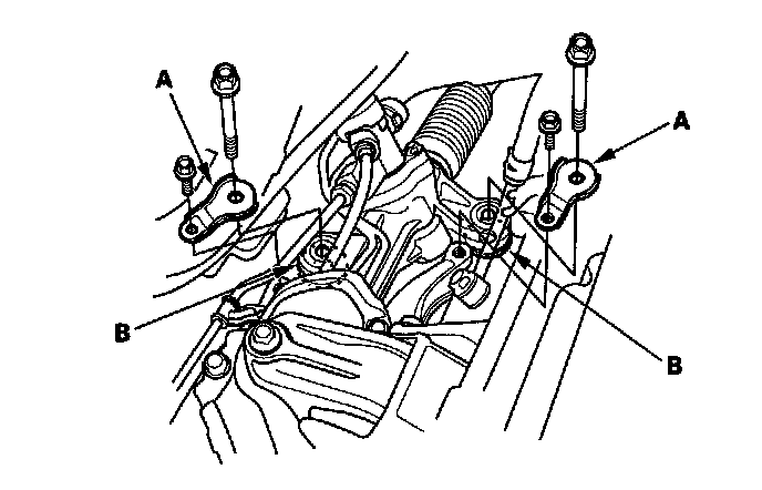 33. Remove the bolt (A) securing the P/S fluid line bracket, and unclamp the P/S fluid line clamp (B) on the front subframe.