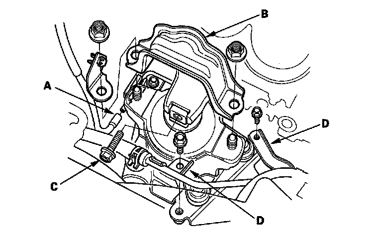 13. Remove the harness clamps (C) and the bracket (D).