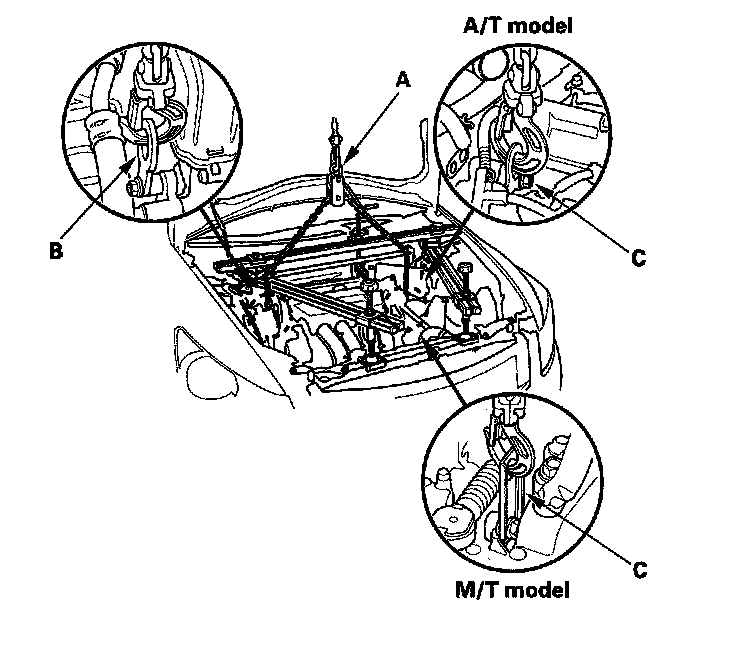 59. Attach a chain hoist (A) to the universal eyelet (B), and the transmission hook (C), then lift the engine/transmission until it's securely supported by the chain hoist, and remove the engine support hanger.
