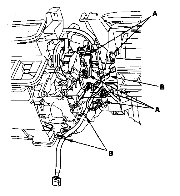 10. Disconnect these connectors (A): The mode control motor, the power transistor, the evaporator temperature sensor, the passenger's air mix control motor (with climate control), and the recirculation control motor. Remove the wire harness clips (B).