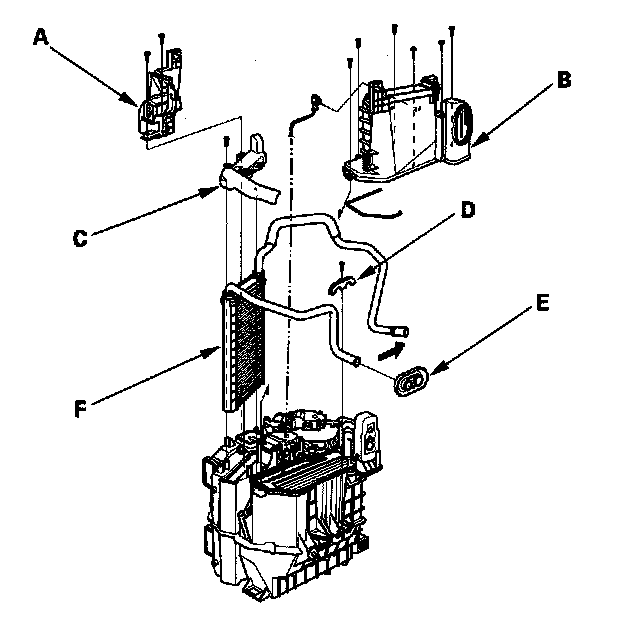 12. Remove the self-tapping screws and the passenger's heater duct (A). Remove the self-tapping screws and the expansion valve cover (B). Remove the self-tapping screw and the heater core cover (C). Remove the self-tapping screws, the heater pipe bracket (D), and the grommet (E), and carefully pull out the heater core (F).