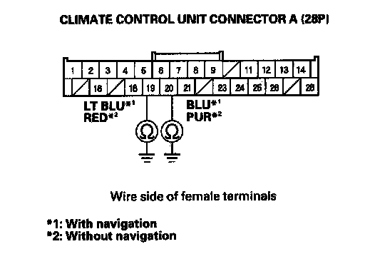 4. Check for continuity between body ground and climate control unit connector A (28P) No. 19 and No. 20 terminals individually.