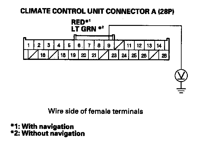 4. Measure the voltage between the climate control unit connector A (28P) No. 9 terminal and body ground.