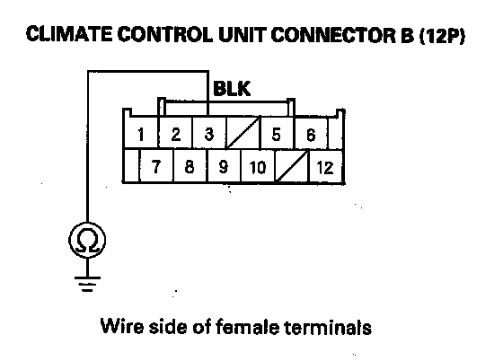 6. Check for continuity between the climate control unit connector B (12P) No. 3 terminal and body ground.