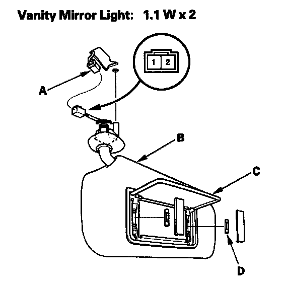 4. If the continuity is not as specified, check the bulbs (D). If the bulbs are OK, replace the vanity mirror light.