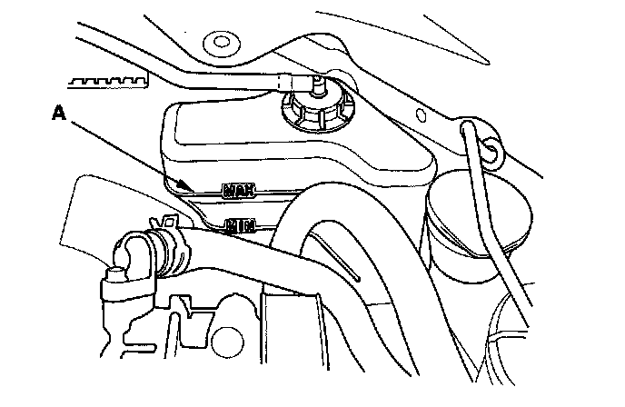 6. Fill the coolant reservoir to the MAX mark (A) with Honda Long Life Antifreeze/Coolant Type 2 (P/N OL999-9011).