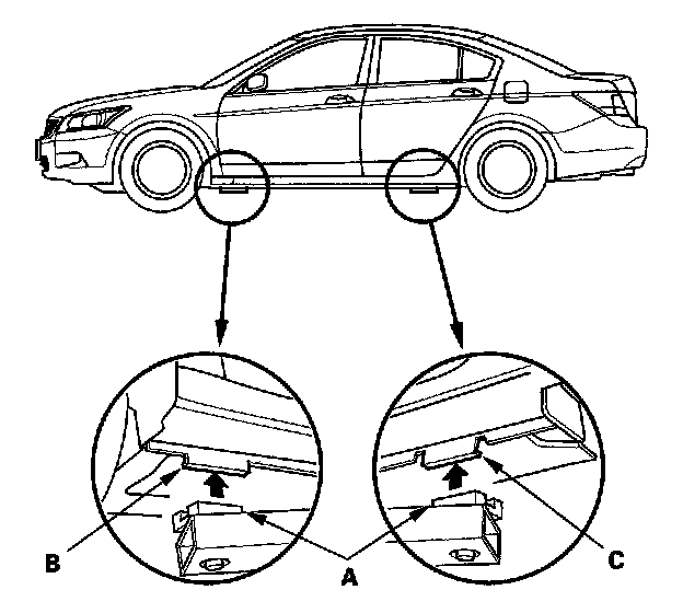 1. Position the lift blocks (A), under the vehicle's front support points (B) and rear support points (C).