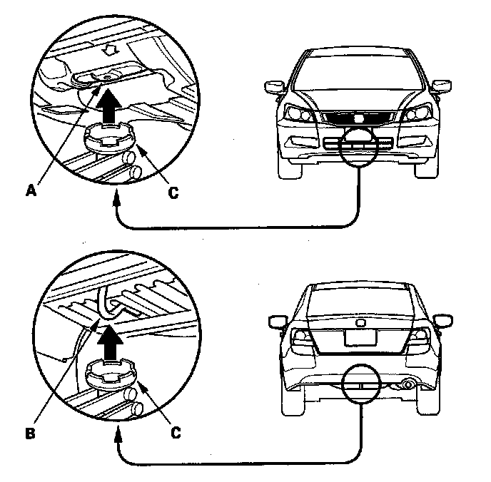 3. Position the floor jack under the front jacking bracket (A) or the rear jacking bracket (B). Center the jacking bracket on the jack lift platform (C), and jack up the vehicle high enough to fit the safety stands under it.