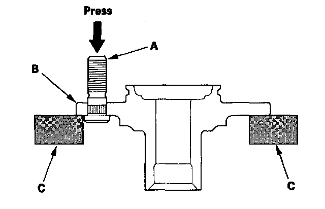 2. Separate the wheel bolt (A) from the hub (B) using a hydraulic press. Support the hub with hydraulic press attachments (C) or equivalent tools.