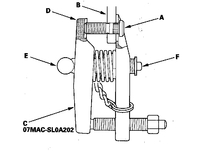 ^ If the angle of the remover against the wheel bolt is not square, readjust the ball joint remover by turning the head (E) of the adjusting bolt (F).