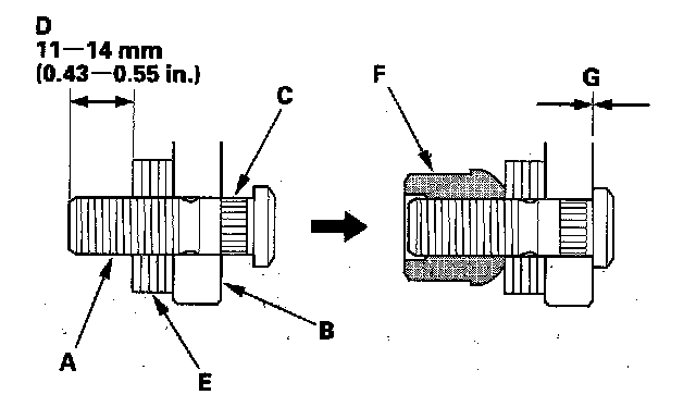 4. Insert the new wheel bolt (A) into-the hub (B) while aligning the splined surfaces (C) on the hub hole with the wheel bolt. Adjust the measurement (D) with washers (P/N 94101-12800 or equivalent) (E), then install a nut (P/N 90304-SC2-000 or equivalent) (F) hand-tight.