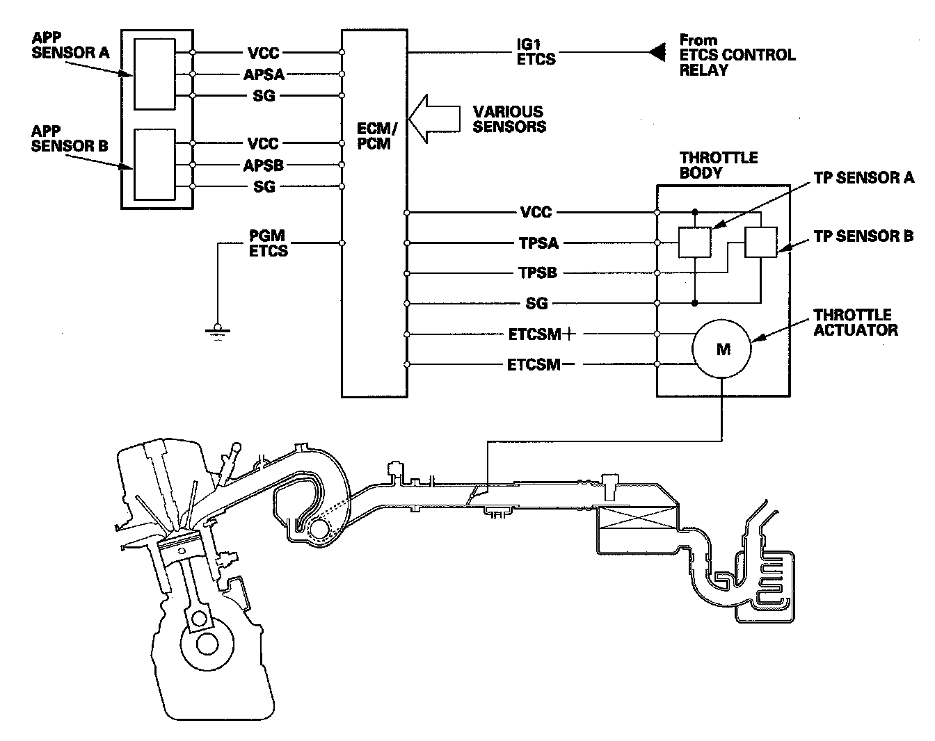 Electronic Throttle Control System DiagramThe electronic throttle control system consists of the throttle actuator, throttle position (TP) sensor A/B, accelerator pedal position (APP) sensor A/B, the electronic throttle control system (ETCS) control relay, and the ECM/PCM.
