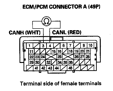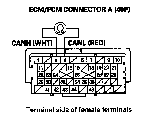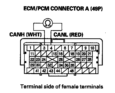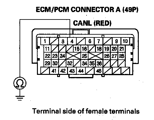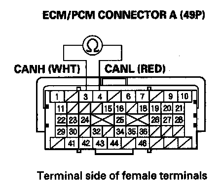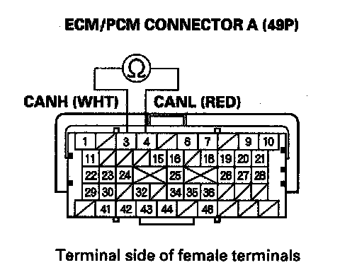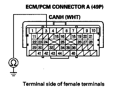 23. Measure resistance between ECM/PCM connector terminals A3 and A4.