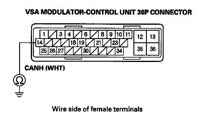 9. Check for continuity between VSA modulator-control unit 36P connector terminal No. 14 and body ground.