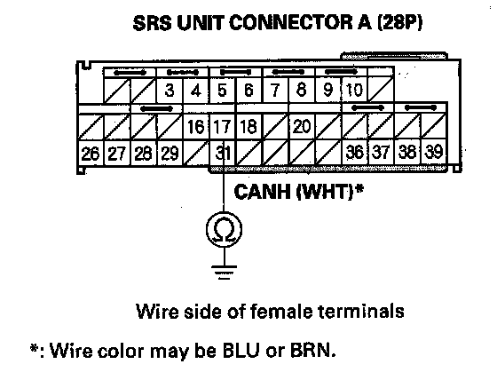 11. Check for continuity between SRS unit connector A (28P) terminal No. 17 and body ground.