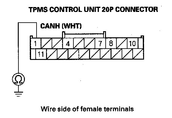 12. Check for continuity between TPMS control unit 20P connector terminal No. 1 and body ground.