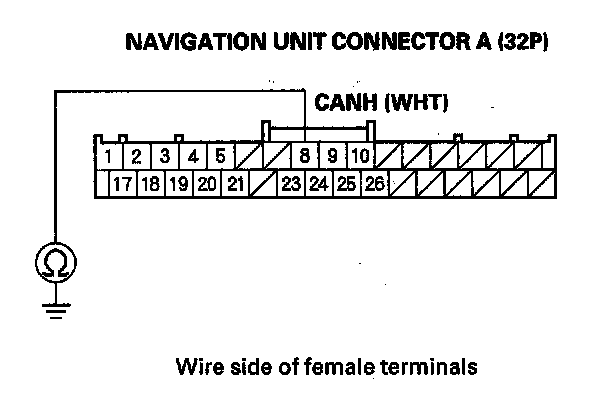 13. Check for continuity between navigation unit connector A (32P) terminal No. 8 and body ground.