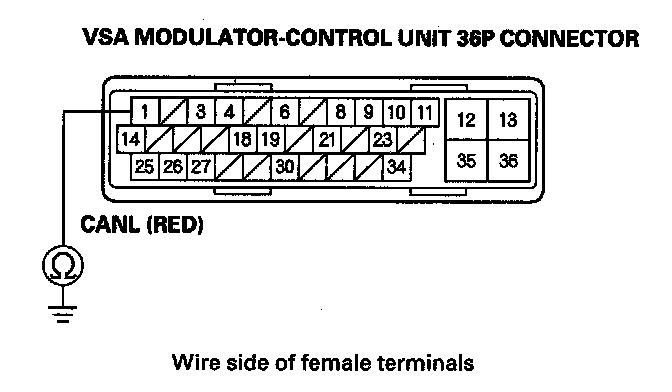 16. Check for continuity between VSA modulator-control unit 36P connector terminal No. 1 and body ground.