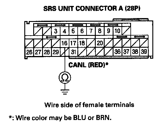 18. Check for continuity between SRS unit connector A (28P) terminal No. 16 and body ground.