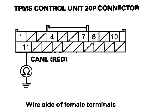 19. Check for continuity between TPMS control unit 20P connector terminal No. 11 and body ground.
