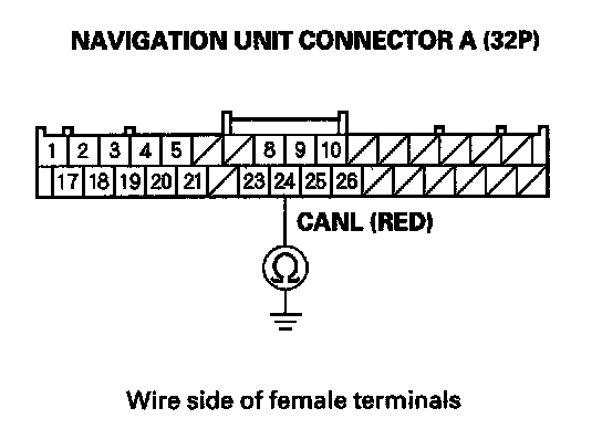 20. Check for continuity between navigation unit connector A (32P) terminal No. 24 and body ground.