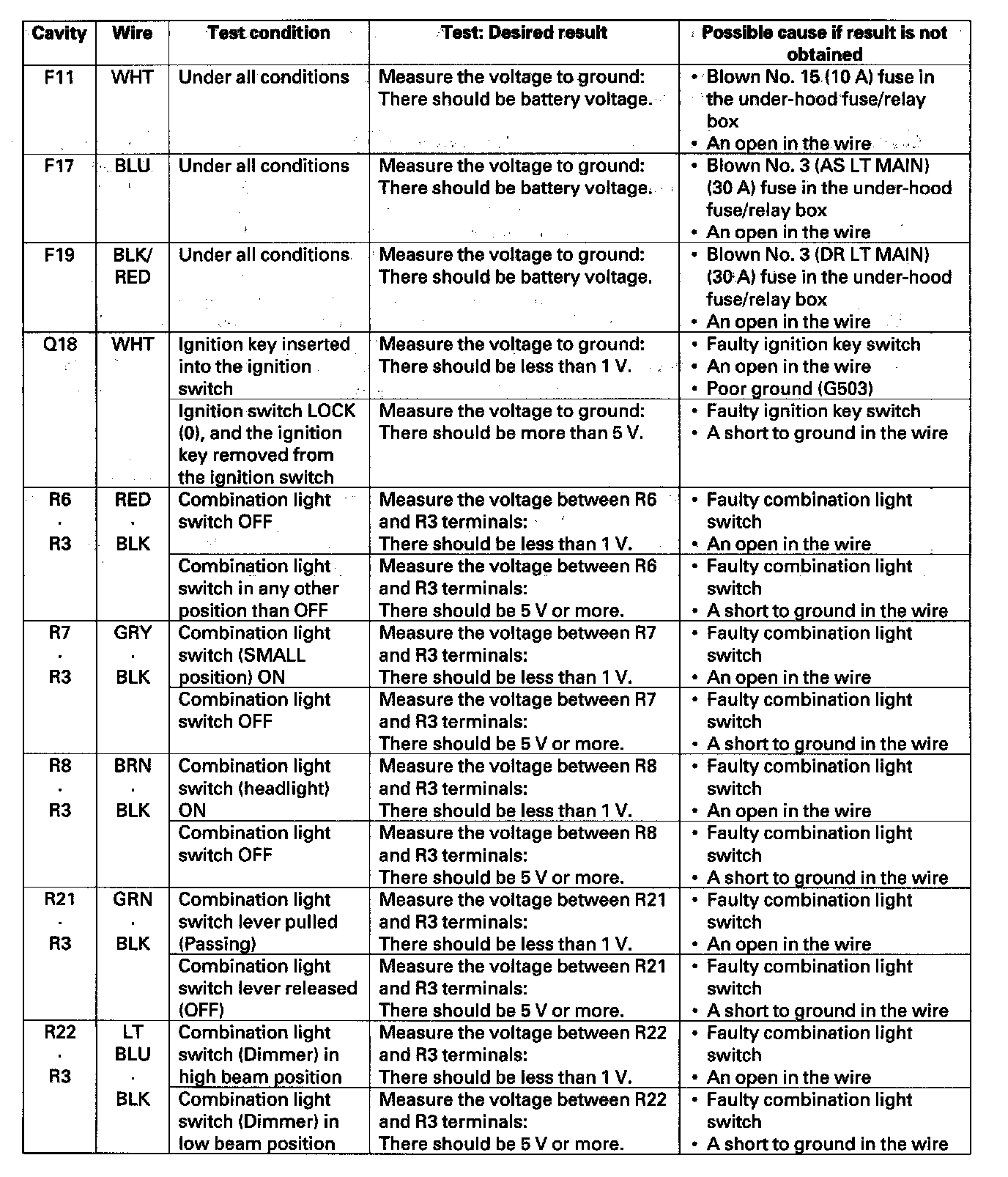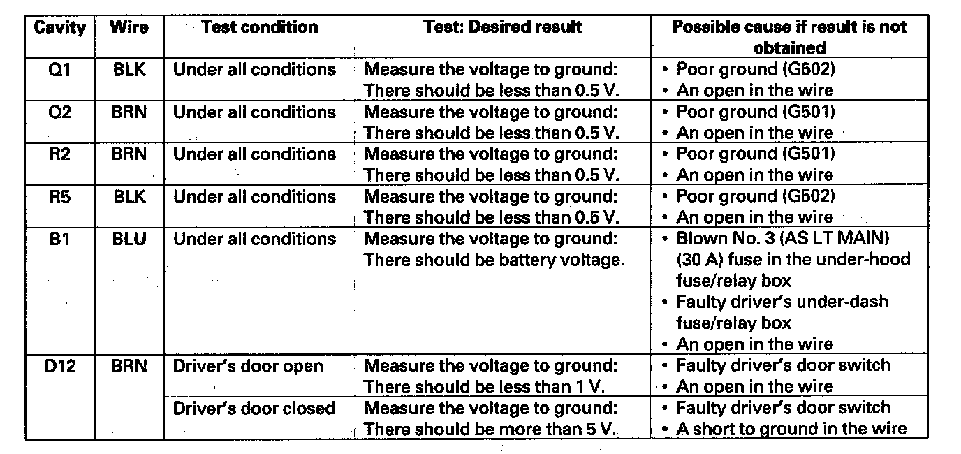 5. Reconnect the connectors to the driver's under-dash fuse/relay box, and make these input tests at the connector.