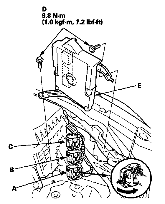 13. Disconnect ECM/PCM connectors A, B, and C, then remove the ECM/PCM assembly (E).