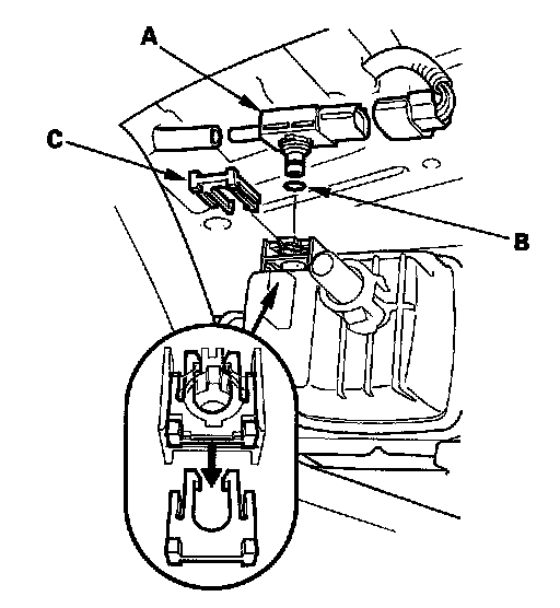 4. Install the parts in the reverse order of removal with a new O-ring (B) and a new retainer (C).