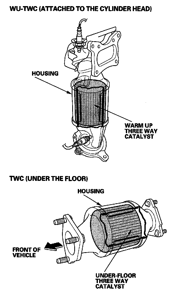 The WU-TWC/TWC converts hydrocarbons (HC), carbon monoxide (CO), and oxides of nitrogen (NOx) in the exhaust gas to carbon dioxide (CO2), nitrogen (N2), and water vapor.
